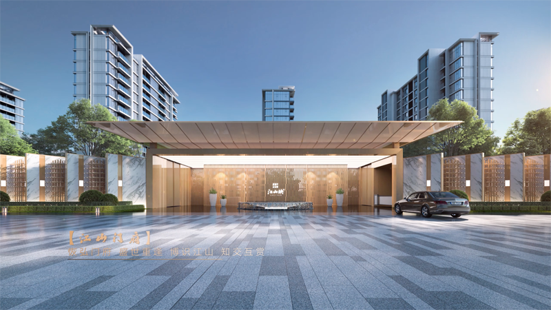 迎宾水景配以喷泉景观以装饰,将镜面水景加以艺术表达,形成龙凤呈祥之势,门庭若水定财源不绝,整体大气、恢弘,具有仪式感。