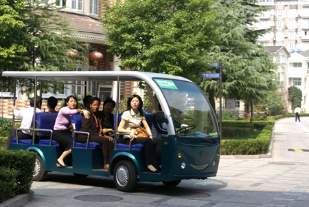 安娜乘观光车在栖月苑游览。