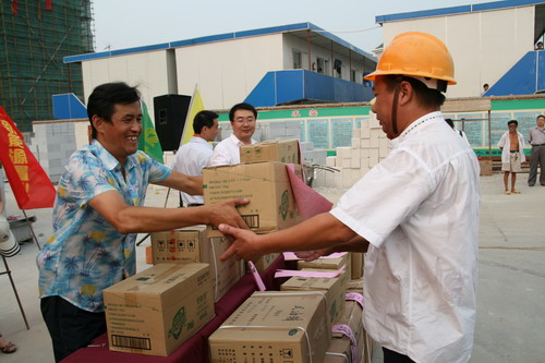 当业主们热情的向工人师傅们发放慰问品的时候,现场气氛达到高潮。现场的工人们说:以前只有单位领导来慰问,业主还从来没有过,这说明新能源确实受业主欢迎,这也让我们意识到自己的岗位虽小,但是责任很大!我们只有把工作做好才能对得起业主。一位施工单位负责人表示:业主慰问对我们是一种鼓舞也是一种压力,我们更要把质量放在心上,以一流的住宅回报业主!