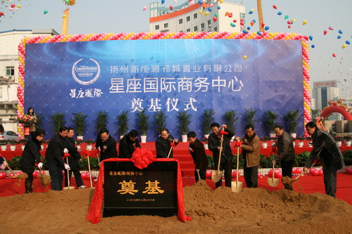2009年12月28日,位于邗江中路的新能源邗城星座国际商务中心隆重举行奠基仪式。邗江区政府、邗江建设局、新能源集团、邗江城市建设置业有限公司等众多领导嘉宾参加了此次奠基仪式。江苏新能源置业集团董事长包广林在发言中表示,作为新能源置业与邗江城市建设置业有限公司共同打造的星座国际商务中心,将在高起点、高要求下,打造扬城商务中心大厦的新标杆,建设扬城独有的高档甲级办公写字楼。