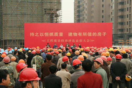 建物有所值的房子,建老百姓放心的房子;一直是新能源;追求的目标,这样的工程质量评比大会在新能源公司每半年就举行一次。尤其是在阳光美第小区的建设过程中,由于该楼盘使用了地源热泵空调系统,而且二期全部采用精装修,这样的住宅对施工要求近乎苛刻。为了保证房屋的建筑质量,除半年一次质量评比大会之外,2010年公司还将推出三项新举措保证工程质量:组织各个项目工地人员互查,外聘专业建筑工程师,另外还聘请业主代表作为工程质量检查人员。