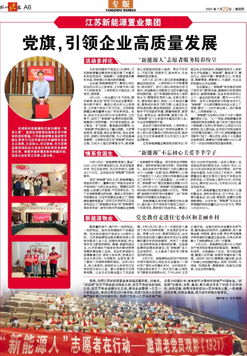 为庆祝中国共产党成立100周年,江苏新能源置业集团党支部开展了丰富多彩的各项活动,“新能源人”志愿者服务精彩纷呈,把党建工作推向新的高潮。