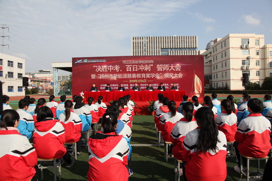 “龙腾九霄担家国责任,拼搏百日扬雄心壮志。”3月8日上午,邗江区实验学校(集团)中学分校举行2024届中考百日誓师大会暨“新能源教育爱心基金”奖学金、奖教金颁奖典礼,江苏新能源置业集团总裁王秋云、邗江区教育局副局长、邗江区实验学校校长葛光出席活动。  10时整,邗江区实验学校九年级学生齐聚该校青春广场。颁奖典礼在《我相信》《相信自己》《怒...